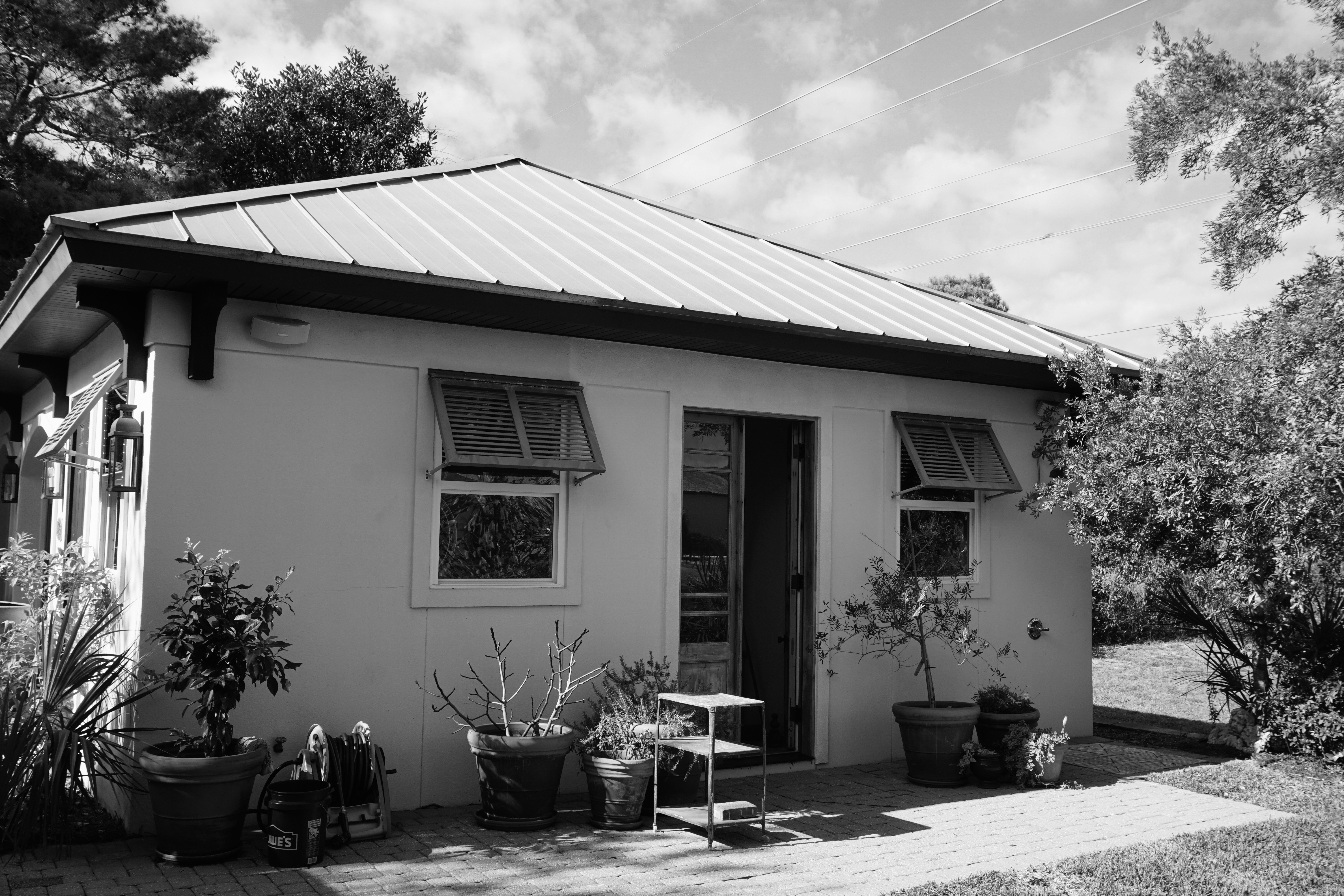 Patricia Hardiman We’re in the garage—or what used to be just the garage. My husband carved this space out for me. Ten, maybe eleven feet by fifteen. We put in antique French doors so I could see the courtyard, the lemon tree, the fountain. I wanted to be able to look out and see a sliver of the lake. My view is important to me.
